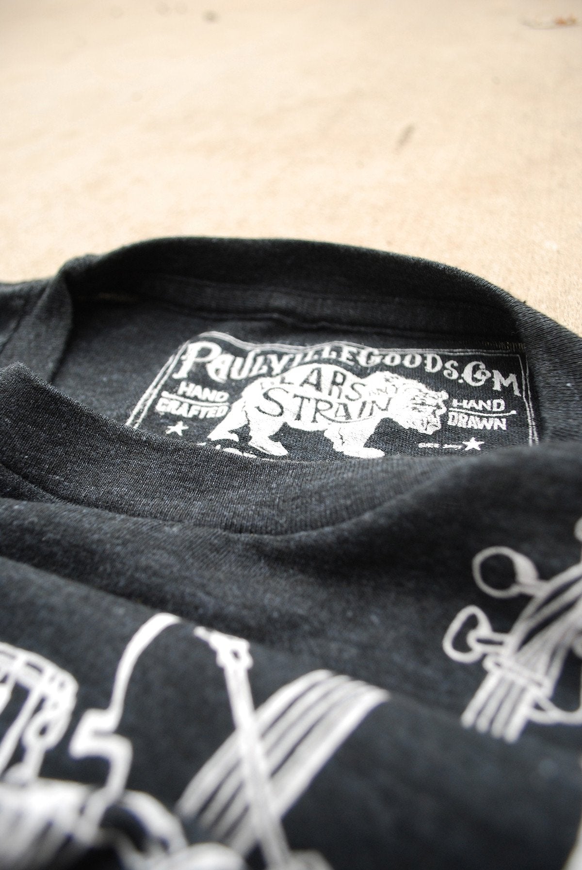 White water based discharge silk screen ink on 50/50 poly cotton blend. Enjoy everything you love about the fit, feel and durability of a vintage T-shirt, in a brand new version. This design is from an original drawing that I did of a stage setup for a band.