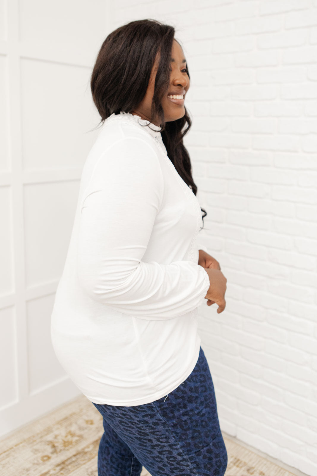 Keywords: White Top, Ruffle, Lace, Crochet, Mockneck