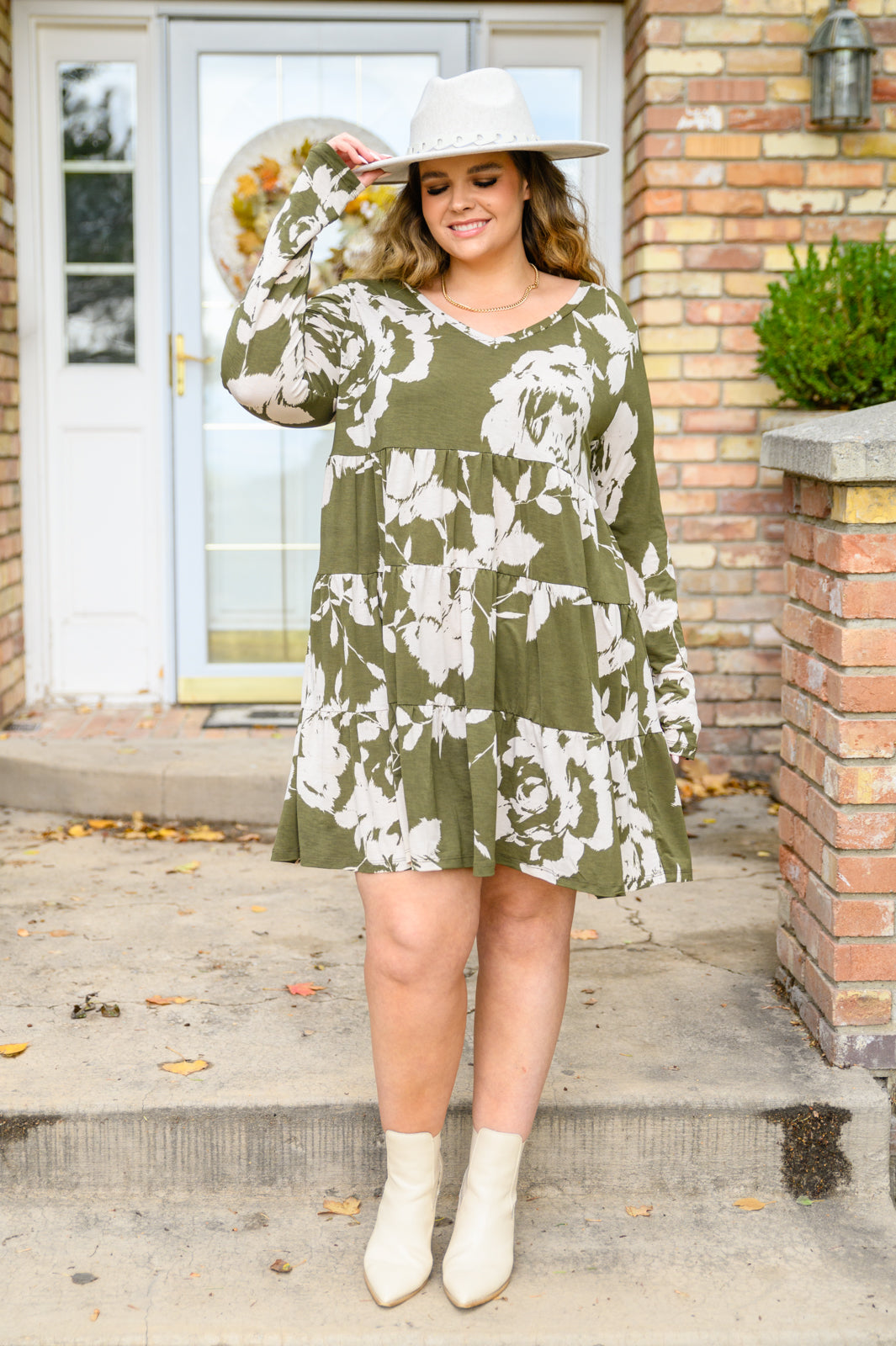 Stay on top of the trends in the Worthwhile Moment Floral Tiered Dress In Olive! Lightweight, stretchy fabric makes up a v-neckline with long sleeves and three-tiered, mini length body. Pair with knee high boots and a jacket for the cutest look!